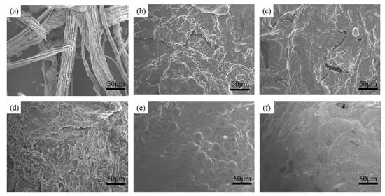 In order to study the variation in the flame retardancy of the different systems, the morphology of the carbon residues of the FNFs after vertical combustion was observed using a scanning electron microscope (SEM). Figure 7 shows an SEM image of the sample residual carbon, with a magnification of 500 times. Figure 7a shows the carbon residue morphology of the FNFs. The FNF sample formed very loose carbon residues after combustion [], while all coated FNFSs had obvious carbon layer formation after combustion, which prevented heat transfer between the flame zone and the FNFs matrix. As shown in Figure 7b, the fiber composite coated with PM-2 monomer formed a rough and cracked carbon layer structure after combustion. With the increase in the PDHAA monomer components, the carbon layer gradually became coherent and dense. However, there were a few cracks in the coke surface, as seen in Figure 7c,d, because of the improper proportion of phosphorus and nitrogen, which led to the formation of a poor quality carbon layer with open bubbles []. As seen in Figure 7e, many wrinkles appeared on the surface of the carbon layer, which may have been due to the shrinkage of the carbon layer caused by the cooling of the coating after combustion []. Compared with the carbon layer of the other samples, the carbon layer of the FNFs-5 was dense and coherent. This also confirmed that the FNFs-5 had better flame retardancy.