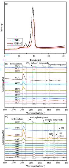 (a) Volatile pyrolysis products of the FNFs and FNFs-5, (b) FTIR spectra of the pyrolysis products of the FNFs, and (c) FNFs-5 at different temperatures.