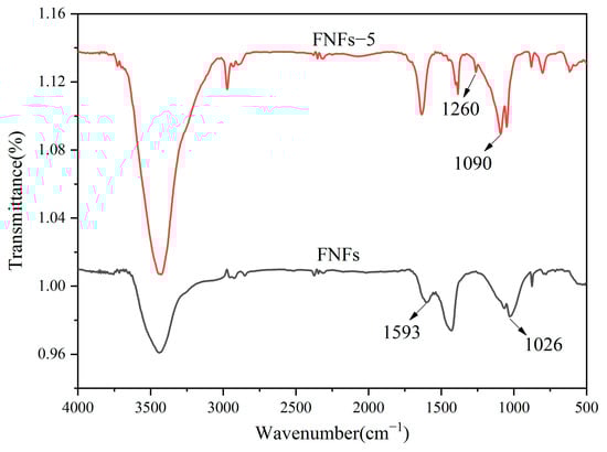 In order to study the structure of the carbon residues after the combustion of the coated fiber composites, the carbon residues after combustion of the FNF and FNFs-5 samples was characterized using FTIR, as shown in Figure 10, and a flame-retardant mechanism diagram of the coated fiber composites is displayed in Figure 11. The FTIR analysis of the carbon residues after combustion of the FNF sample showed that the peaks at 1593 cm−1 and 1026 cm−1 were aromatic carbon and C-O vibration bands. In the carbon residues of the FNFs-5 sample, the peaks at 1260 cm−1 and 1090 cm−1 corresponded to the POO- groups and P-O vibrational bands []. The FTIR results indicated that there were polyphosphoric acid and phosphates in the residual carbon, and the phosphate compounds formed during the combustion process of the coating promoted the formation of the carbon layer and covered the surface of the fiber composite material. The carbon layer could effectively isolate the sample from heat and oxygen. Therefore, the cooperative effect of the phosphorus and nitrogen elements in the coating gave the fiber composites excellent flame retardancy.