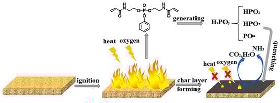 Phosphorus−nitrogen (P−N) flame retardant is a kind of highly efficient halogen-free flame retardant. Due to its low toxicity, low smoke, and lack of corrosive gas during combustion, this kind of flame retardant has been widely used in flame-retardant coatings and polymers [,,,,]. At present, P–N flame retardants can be divided into P–N mixed intumescent flame retardants and P–N single molecule intumescent flame retardants. Mixed intumescent flame retardants are realized by compounding and adjusting the ratio of the different phosphorus and nitrogen flame retardants, which are mainly used in epoxy resin [], polyolefin [], intumescent coatings [], etc. Single molecule intumescent flame retardants that integrate a carbon source, acid source, and gas source can show excellent flame-retardant performance and overcome the disadvantages of a low thermal stability and poor compatibility [,]. A phosphate–nitrogen-based reactive diluent (DHMPP) was mixed with epoxy acrylate (EA) in certain ratios, to prepare a flame-retardant wood coating. The LOI of the wood coating reached 33% and achieved a UL-94 V-0 rating []. The researchers developed a novel flame retardant (ethoxy piperazine (phenyl) phosphoryl ethyl methacrylate (EPPEM), containing phosphorus, nitrogen, and benzene ring, and applied to the surface of PET/CO fabrics. Compared to PET/CO fabrics, the LOI of the UV-cured fabrics containing 300 g/L EPPEM solution increased from 17.8% to 27.2%, indicating that the introduction of EPPEM improved the flame retardancy of the fabric [].