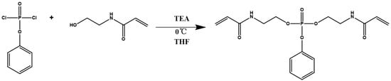 Phenyl dichlorophosphate (PDCP), N-hydroxyethyl acrylamide (HEAA), and triethylamine (TEA) were provided by Aladdin Reagent Co., Ltd. (Shanghai, China); 2-hydroxyethyl methacrylate phosphate (PM-2) was provided by Guangzhou Lihou Trade Co., Ltd. (Guangzhou, China); and 2-hydroxy-2-methyl-1-phenyl-1-acetone (Darocur 1173) was provided by McLean Co., Ltd. (Shanghai, China); The PDCP, HEAA, and TEA were dried with a 4A molecular sieve before use. Tetrahydrofuran (THF) was provided by Sinopharm Reagent Co., Ltd. (Shanghai, China) and flax/kenaf/polypropylene fiber composites were provided by Bochao Auto Parts Co., Ltd. (Changchun, China).