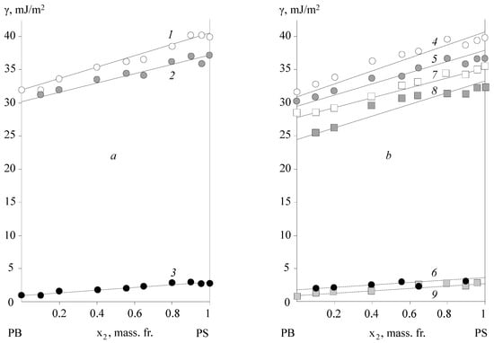 Thirdly, following the ideology of Cassie and Baxter [], we estimated the surface fractions x1 occupied by the monomer links of PS, PAN, and PVA. For this purpose, we used the experimental data on the surface energies of the BSC and BNS copolymers in Equation (1).