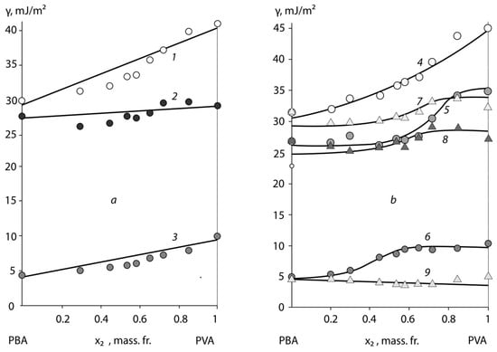 Dependence of the surface energy γ (1, 4, and 7) and its polar γP (2, 5, and 8) and dispersion components γD (3, 6, and 9) on the composition of BSC copolymers at 293 ± 1 K. BSC surface is formed on the: (a) air—(1, 2, and 3), and (b) aluminium—(4, 5, and 6) and PTFE—(7, 8, and 9).