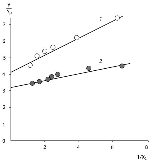 where x2 is the copolymer composition, K is the group adsorption equilibrium constant, and γP/γ is the polar component of the surface energy, proportional to the degree of the filling of the polar groups in the substrate. It can be seen (Figure 5) that the dependence plots γ/γp − 1/x2 area linear relationship, cutting off a segment that is proportional to the surface concentration of the active centres on the substrate surface of the ordinate axis, and the slope of these straight lines allows for the determination of Langmuir equation constant.
