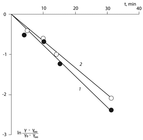 It has been shown for the first time that the relaxation kinetics of γ and γp are satisfactorily described by this Equation (Figure 7), and that the relaxation times calculated for the polar component and the surface energy, in general, practically coincide with each other within an error. The activation energies of the processes of the conformational rearrangements of the macromolecules in the surface layers of the copolymers were calculated using these values. The numerical values of the activation energies of these structural rearrangements are given in Table 4.