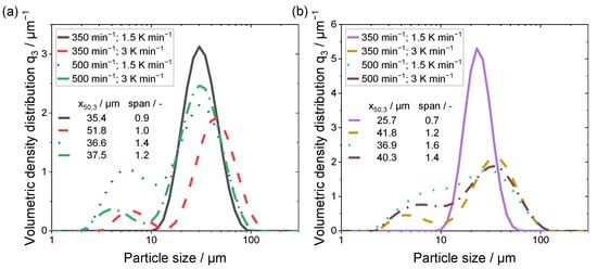 A noticeable divergence in the shape of the curves is displayed for both samples in Figure 3a,b, with the process parameters of 350 min−1 in combination with a cooling rate of 1.5 K min−1. The span exhibited has the smallest values (<1), however the mean particle size x50,3 is comparable to the other powder samples. Additionally, only this parameter combination yielded a monomodal distribution. Therefore, this process parameter combination shows the most promising particle size distribution, as the lower stirring speed induced less shear force during the droplet formation and growth processes leading to a monomodal size distribution with fewer fine particles.