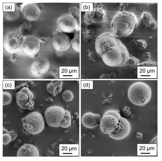 Considering an increase in the stirring speed (see Figure 5c,d), the lower cooling rate shows a large variety in the resulting particle shapes, similar to Figure 4c. However, the larger particles are more likely to show a spherical structure, whereas grape-shaped structures are observed for particles with sizes below 30 µm. The increase in the cooling rate yields the formation of potato-shaped particles regardless of the particle size. Similar to Figure 4d, the large particles are to some extent covered with extremely small ones.