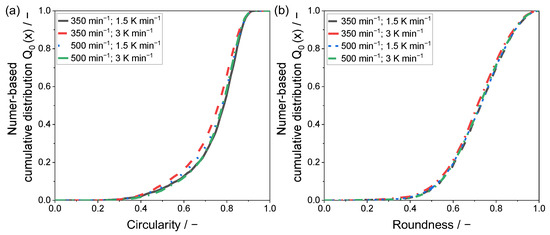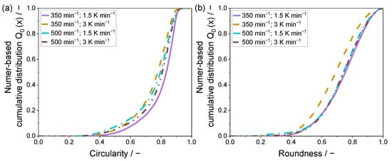 For a quantitative evaluation of the resulting particle shapes, a two-dimensional analysis by means of light microscopy was applied. The determined values for the shape factors circularity and roundness are given within a number-based cumulative distribution in Figure 6 and Figure 7.