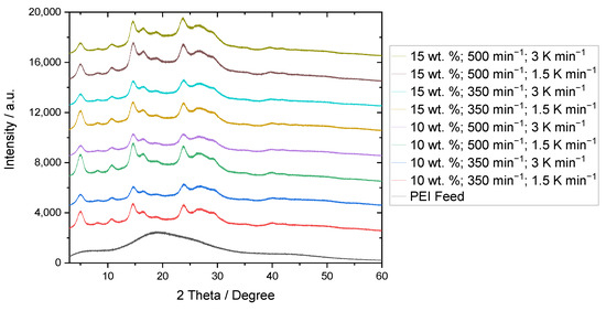 The structural analysis of the precipitated PEI powder samples has already been addressed in [21]. There, the presence of polymorphism was found. Nelson et al. [33] and Hsieh et al. [34] similarly investigated the crystalline structure of the modified polyetherimide material, however, they used the solvents n-methyl pyrrolidone and methylene chloride. Depending on the solvent and procedure, differing reflexes were observed in X-ray diffraction. According to Figure 8, the position of the reflexes obtained for the solvent treatment with acetophenone is consistent, independent of the applied process parameters.