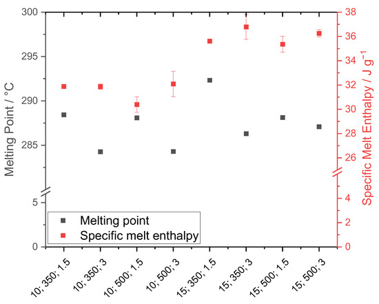 Thermal analysis was performed with respect to the melting temperature and the specific enthalpy of fusion (Figure 9). The x-axis shows the used process parameters, although the units are not included for spatial reasons.