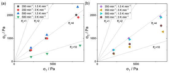 The investigation of the flowability was performed using a ring shear tester, where the resulting factor describes the flowability class according to Jenike. Figure 10a,b displays the respective measured unconfined yield strengths and consolidation stresses . The solid black lines mark the characteristic factors. According to Jenike, flow factors of 4 and above characterize a properly flowing powder material, whereas values below 4 show cohesive behavior. For flow factors above 10, the material is free flowing.