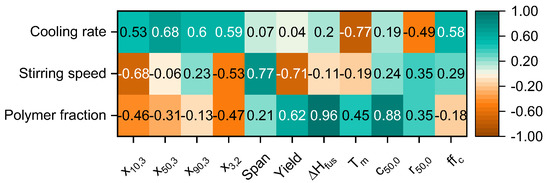 The multivariate correlation matrix containing the Pearson’s Linear Correlation Coefficient ρ(a,b) is presented in Figure 11. Positive correlations are marked in green, negative ones are depicted in orange. Color intensity signals the magnitude of the correlation. The correlations of the three main components (e.g., polymer fraction, stirring speed and cooling rate) are analyzed first, and afterwards the reciprocal correlation of the particle properties is investigated.