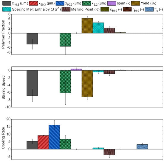 The stirring speed had the strongest impact on the fine fraction particle size (−6.9 µm, to a minimum x10,3 of 12.2 µm), followed by the weaker impact of the polymer fraction (−4.6 µm). This simultaneously affects the Sauter diameter x3,2 (−5.5 µm, −6.1 µm, and +6.7 µm), where the percentage decrease is smaller as the Sauter diameter initially has larger particle sizes. The cooling rate (+5.3 µm) has a positive impact on the fine fraction particle size. Despite this, the fine fraction size is predominantly controlled by the polymer fraction and stirring speed.
