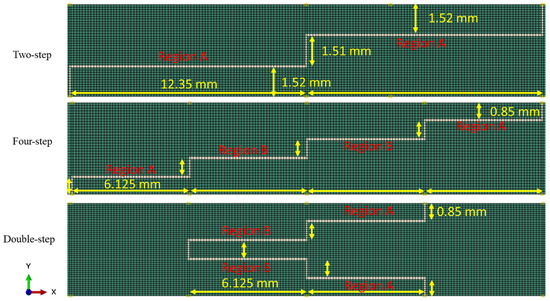 In this study, various step-lap joints with different numbers of steps and configurations were analyzed. Figure 2 shows their details. Namely, the two-step-, four-step-, and double-step-lap joints, on top of the three-step-lap joint, were compared and contrasted.