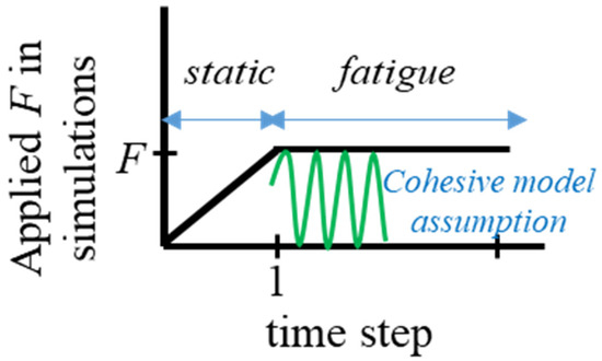 ABAQUS’ elastic fully plastic constitutive equations were utilized to analyse the adherends’ behaviour. The behaviour of the adhesive layer was simulated using the fatigue damage model, that was created by degrading the bi-linear traction-separation response within the cohesive zone modelling scheme. Following the research in [23], the fatigue load was applied, as shown in Figure 3. At first, the maximum load (the tensile load applied to the joint) was delivered in a static step, where no accumulation of fatigue damage took place. The fatigue step came next, where the peak load was maintained and the fatigue deterioration was computed using the cohesive model assumption. The number of loading cycles during this cycle was assumed to be proportional to the time increment of the analysis [21].