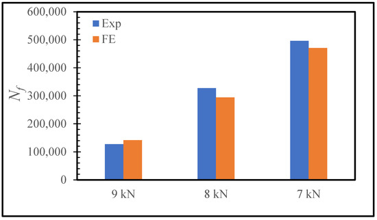 Number of cycles to failure (Nf) for the three-step-lap joint subjected to different amounts of cyclic tensile loads obtained experimentally [15] and numerically.