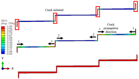 Distribution of the fatigue damage in the adhesive layer with the crack propagation direction and its sequence for the three-step-lap joint subjected to 8 kN tensile loading at Nf/3 (top), 2Nf/3 (middle), and when the complete damage occurred at all of the points of the adhesive layer (bottom). Numbers 1 and 2 in the figure represent the sequence of the crack propagation.