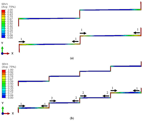 Distribution of the fatigue damage in the adhesive layer with the crack propagation direction and its sequence for the two- (a) and four-step-lap joints (b) subjected to 8 kN tensile loading at Nf/3 (top) and 2Nf/3 (bottom). Numbers 1 and 2 in the figure represent the sequence of the crack propagation.
