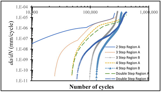 da/dN plots were made for all of the configurations under consideration in order to obtain insight into the step-lap joints’ failure response, with respect to the number of steps (Figure 7). Overall, as the cyclic loading progressed, the rate of crack propagation increased, but they were either in an increasing or a decreasing manner. It was noticed that the two-step-lap joint had the largest da/dN in the course of the fatigue loading, proving the shortest Nf, as seen in Table 2. A sudden jump was noticed when N = 246,620 cycles. At this number of cycles, the damage reached all of the elements, especially those at the mid-region of the adhesive layer, where, onwards, the crack propagation occurred very quickly. When the three-step-lap joint was analysed, the crack propagation was observed to begin in Region A at around the 24,000th cycle (see Figure 1), which was much earlier than in Region B, where it started around the 97,000th cycle. It should be emphasized that at these cycles, the damage just began at a material point with a small amount of damage and should not be mixed with Ni. It was noted that while the propagation rate was more in a saturation mode in Region A (except for the last part of the loading), it was in a steeper mode in Region B. That explains how the da/dN for Region B reached the 1.00 × 10−5 mm/cycle, which is similar to that reached in Region A before the fatigue failure, even though the crack propagation in Region B started at a much later stage. A similar distribution of da/dN was attained for the four-step-lap joint. The main difference was the number of cycles at which the crack started to propagate in different regions. For instance, the crack began to expand at 48,000 cycles and 126,000 cycles in Regions A and B, respectively, with a difference of 78,000 cycles for the lap joints with four steps, while this difference was 73,000 cycles (24,000, 97,000 cycles) for the one with three steps. When the da/dN values of the lap joints were compared for the three- and four-step-lap joints, they were smaller for the latter one. That proved the longer service life of the step-lap joint with a greater number of steps. The da/dN plots of the step-lap joints differed from those of the single-lap joints (see [21]), where in the latter, the crack growth rate increased gradually over the course of the fatigue loading, followed by a sudden jump just before the fatigue failure. However, in the step-lap joints, as different parts of the adhesive layer at different steps affected each other during the loading, the da/dN curves showed different characteristics.