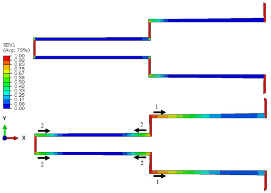 Distribution of the fatigue damage in the adhesive layer with the crack propagation direction and its sequence for the double-step-lap joint subjected to 8 kN tensile loading at Nf/3 (top) and 2Nf/3 (bottom). Numbers 1 and 2 in the figure represent the sequence of the crack propagation.