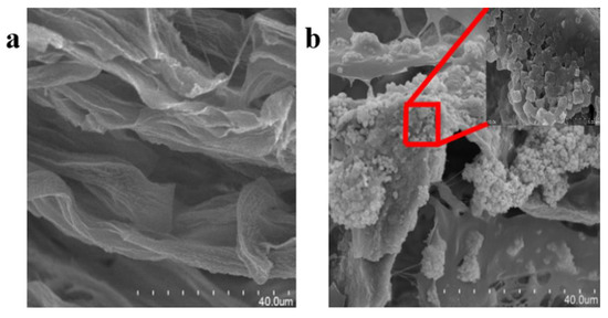 A membrane-making method combining electrospinning and seed growth could effectively solve the problem of the low loading of MOF particles during electrospinning. Due to the increased loading capacity of HKUST-1 on the nanofiber membrane, the CO2 capture capacity has been shown to also be significantly improved. In addition, after using this membrane for multiple-cycle adsorption, the MOF membrane still had high CO2 adsorption performance, showing high cycle stability and low production costs. These advantages made this MOF membrane suitable for large-scale applications [97]. In addition, one previous study confirmed that a polyethylene-chitosan-hydrogel network as the base material (Figure 6a), and the network structure filled with carbonic anhydrase-modified MOF material (CA@ZIF-8) could produce a MOF membrane with excellent recyclability (Figure 6b). This porous structure, shown in Figure 6a, can improve the mass transfer of both matrix and product. Moreover, as shown in Figure 6b, CA@ZIF-8 can still keep its structure intact in this porous structure. The MOF membrane also had an excellent carbon dioxide capture capacity, which was 20 times higher than that of traditional carbonic anhydrase materials. Additionally, the MOF membrane exhibited good stability, and the activity of the membrane could be still maintained at half of the original value after 11 cycles. Moreover, the MOF membrane could be directly recovered after CO2 capture without complicated operations such as high-speed centrifugation, which reduces the cost of large-scale applications [98].