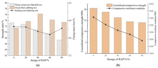 It can be seen from Figure 9a that in the immersion Marshall test, the residual stability of the specimen decreased with the increase of RAP dosage. In the freeze–thaw splitting experiment, the splitting strength ratio increased first and then decreased with the increase of RAP dosage. The nature of the force on the specimen in the freeze–thaw splitting test is different from that in the Marshall stability test; the main force on the specimen in the splitting test is the tensile stress generated by the external load. When the internal bonding force of the specimen is insufficient, it will lead to damage of the specimen. In the Marshall stability test, the specimen is mainly affected by radial pressure, and the main influencing factor is the friction between mineral particles, so there is a certain gap between the two.
