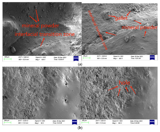 The microstructure of PCRM with RAP and without RAP was compared and analyzed by SEM. It was found that the surface of the two mixtures was covered with a relatively uniform polyurethane binder film. After the incorporation of RAP, due to the difference in the microstructure of the RAP surface, the polyurethane–aggregate interface structure was greatly different. The surface of the mixture was rougher than that of the mixture without RAP, and there were many micron-scale pores, cracks, and other defects on the surface. These micron-scale defect damages will negatively affect the mechanics and durability of PCRM.