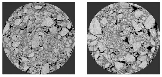 To explore the distribution characteristics of voids and cracks in the mixture under different stress modes, the PCRM specimens after splitting failure and uniaxial compression failure underwent industrial CT for scanning. The CT images of the middle layer of the specimen were selected, and the failure mode of PCRM was analyzed by intuitive analysis. The CT scan images of the middle layer of the specimen are shown in Figure 15.