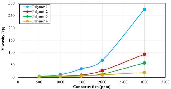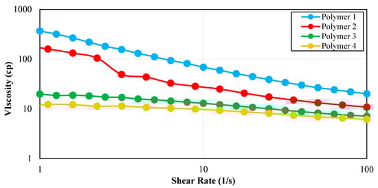 All four polymer solutions were prepared in synthetic seawater to remove the effect of non-ionic materials. Additionally, these solutions were prepared under aerobic conditions. It was observed that all polymers followed the shear thinning behavior (Figure 1) which is an important consideration for field applications of polymers [40]. At a high shear rate, which is experienced by the fluid in the tubing during injection, the polymer should have lower viscosity to minimize injectivity problems. Conversely, at a low shear rate, which happens in the reservoir, the polymer should have higher viscosity to achieve a lower mobility ratio and more piston-like movement. Figure 2 shows the rheology test results for all four polymers as a function of concentration.