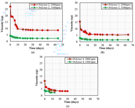 Once the polymer reaches an optimum degree of hydrolysis, further hydrolysis by bacterial activity can cause a reduction in solution viscosity by converting amide groups to acrylate groups and degrading the molecular chains [49]. Thus, increased hydrolysis above the optimum value can be the reason for the reduction in Polymer 3 viscosity in CSW after 1 month. The viscosity of Polymer 3 in CSW after 1 month was only 4% below that of the same polymer in synthetic brine, whereas the viscosity of Polymer 2 in CSW was around 43% less than its viscosity in synthetic seawater. Overall, the results obtained in Figure 5 show that Polymer 3 is more stable in the presence of bacteria in make-up brine compared to Polymer 2.