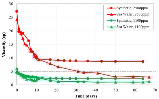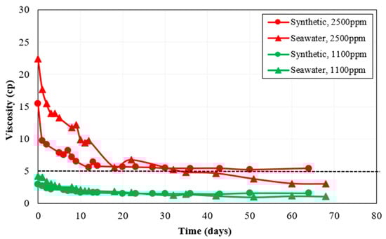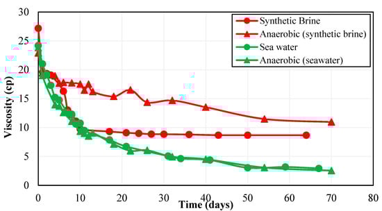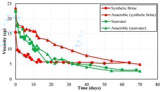 According to the work conducted by Nazina et al. [44], the Caspian seawater contains temperature-resistant bacteria that are capable of sulfate reduction. Moreover, the presence of sulfate-reducing bacteria in Caspian Seawater is also supported by a high content of H2S in Caspian Seawater reported by Ivanov et al. [46], as the authors performed a detailed biogeochemical analysis of the water samples from a Caspian Sea water column. In this context, after choosing the best polymers based on rheology and long-term thermal stability analysis, the next step was to select the best brine–polymer combination among Polymer 2 and Polymer 3 based on the performance of each polymer in the presence of bacteria in the make-up brine. For this purpose, polymer solutions were prepared in CSW. The primary difference between polymer solutions prepared synthetically and with seawater was due to the presence of bacteria in CSW. Polymer 2 and Polymer 3 samples prepared with CSW as make-up brine were then tested for long-term aerobic thermal stability. Figure 4 shows Polymer 2 thermal stability results for synthetic brine and seawater.