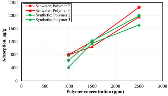 The polymer adsorption values in the range of 1700 to 2500 μg/g of rock were obtained for different brine–polymer combinations at 2500 ppm polymer concentration. Similar static adsorption results have been reported by Al-Hajri et al. (2020) where static adsorption for various HPAM-based polymers after 24 h of residence time with crushed sandstone was in the range of 1300 to 3800 μg/g of rock at 1000 ppm polymer concentration and a liquid-to-solid ratio of 13. It can be seen from Figure 8 that Polymer 3 has lower static adsorption than Polymer 2 at all concentrations in both synthetic brine and seawater. The static adsorption of Polymer 3 at a concentration of 2500 ppm was 13–14% less compared to that of Polymer 2 in both make-up brines. The lower static adsorption of Polymer 3 can be explained by higher stability and repulsion between its molecular chains, resulting in a smaller number of molecules required to satisfy the adsorption capacity of sandstone grains.