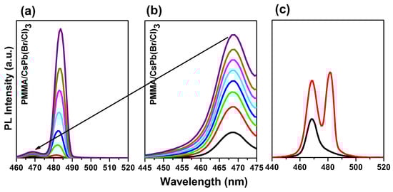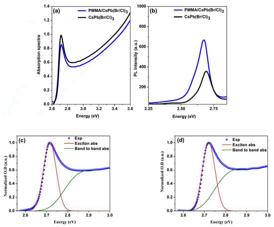 The optical absorption spectra in the UV-Vis region of the bare and the encapsulated samples in the thin film state, measured at RT, are shown in Figure 2a. The absorbance spectrum decreases with rising wavelength, with an absorption edge at ~2.77 eV (447 nm) and a sharp peak at ~2.73 eV (455 nm). This peak shows the presence of an excitonic transition, as well as the film’s high crystal quality [,]. The absorption onset can be seen near the band edge of the pure CsPb(Br/Cl)3 perovskite []. As for the peak absorption position of the films, it’s clear that the absorption spectrum exhibits three broad features: band-to-band transitions, a strong exciton peak, and a low energy absorption tail below the band gap [,,]. The matching of the absorption spectra of both samples confirmed the crystal structure had not changed. The PL spectra for both configurations, measured at RT with an excitation wavelength of the incident light beam of λex = 355 nm, are shown in Figure 2b. The PL peak position of the bare sample, which is located between CsPbCl3 and CsPbBr3, shows that the band structure of CsPb(Br/Cl)3 halide solid solutions can be controlled by the exchange of halogen ions. Furthermore, the peak position of the PL band coincides with the peak position of the exciton absorption band. As a result, it is possible to infer that the PL from both films corresponds to the emission of free excitons [].
