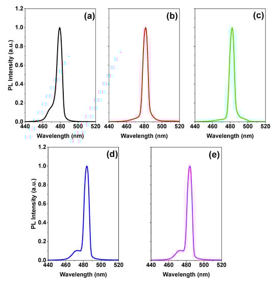 PL of CsPb(Br/Cl)3 thin films above the energy density threshold for different thicknesses of a passivation layer on; (a) without polymer (0 nm), (b) 100 nm, (c) 200 nm, (d) 400, and (e) 500 nm.
