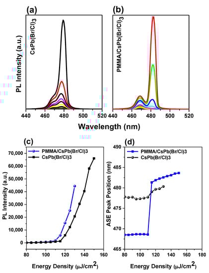 ASE Pump-fluence relationship for CsPb(Br/Cl)3 perovskites thin film: (a) bare sample, and (b) encapsulated sample. (c) The PL intensity and (d) peak position vs their energy density of CsPb(Br/Cl)3 thin films, both bare and encapsulated samples.