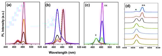The laser peaks at 474 nm moved to 482 nm, and the position of the ASE peak’ shifted as a function of pump energy density (Figure 4d). There are few reports on the formation origin of these two peaks in perovskite-type materials [,,,]. Many factors, including reabsorption effects during single exciton amplification, [,,] biexciton recombination, [,,,,,], temperature effects due to the pump source heating the sample, defect transitions, and bandgap renormalization [,], may have contributed to the ASE redshifts [,,,,,,,,,,,]. The two peaks are caused by surface defects, according to Priante et al., with the lower energy peak having a much higher DOS and the greater energy peak having a limited DOS []. When the excitation energy is raised, there is no defect-like signature for the wide peak, which has a limited DOS, and the photogenerated excess carriers begin to saturate the PL intensities.