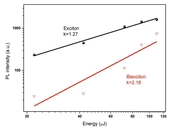 A quadratic dependence of the intensity of the ASE integral on the excitation density is considered by many to be additional evidence for the bi-exciton structure of the ASE band. Based on generally accepted arguments in the literature, our experimental data are therefore consistent with the widely held assumption that the ASE band has a bi-excitonic origin []. The integrated emission intensity is plotted against excitation energy in Figure 8 using the data from Figure 7a. Based on the results of the fit, the two emission peaks can be categorized as free exciton (denoted as X) and bi-exciton emission (denoted as XX) (Figure 8). The energy-dependent integrated emission intensity can be well described by IPL Iexk, where IPL stands for the integrated PL intensity, Iex stands for the excitation power, and k stands for the fitting parameter [,]. The k values for these two emission maxima are 1.27 and 2.18, respectively, (Figure 8). The integrated intensities confirm that the redshifted peak is due to bi-exciton emission. The amplitudes Ix and Ixx, respectively, exhibit linear () and quadratic () dependences on the excitation fluence. The latter confirms that a bi-exciton transition is what is causing the red band (Figure 8) and intensity-dependent spectra are caused by a bi-exciton transition because the stimulated emission originates at the energy position of the bi-exciton transition. The integrated stimulated emission intensity exhibits unambiguous threshold behavior, with the biexciton PL transitioning to stimulated emission at an ultralow threshold of 110 µJ/cm−2.