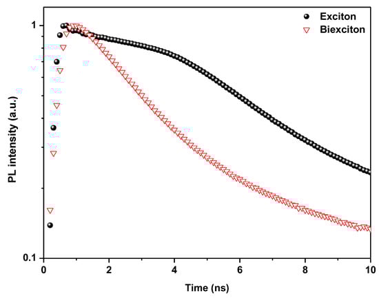 At higher excitation fluence, the PL trace has a slightly faster decay time of τ2 = 4.39 ns, with a 33 ns tail. We can estimate a biexciton lifetime of τxx = (τ2 − Ixτx)/Ixx = 1.10 ns by focusing on the picosecond decay times and using the respective ranges of exciton and biexciton emission from Figure 5 at the same excitation fluence. The τxx/τx ratio of 1:6.7 rules out the possibility that nonradiative Auger recombination dominates the biexciton lifetime. In a recent study, Auger lifetimes of up to 10 ns were found (see ref. []), which is almost an order of magnitude longer than the measured radiative lifetimes [].