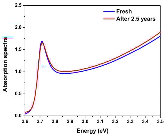 Finally, the bi-exciton emission stability can be determined from the binding energy value. Figure 10 shows the optical absorption of the encapsulated samples configuration thin film in two states; fresh and after 2.5 years. The excitonic behavior changed with time, indicating a change in the exciton binding energy, but this change is relatively small. As mentioned above, a higher exciton binding energy increases the probability of bi-exciton formation [,]. The binding energy of biexcitons implies a residual in-plane center-of-mass confinement, which is advantageous in our case because biexcitons are stable at room temperature. Due to the fact that if the binding energy is greater than the thermal energy, as demonstrated by kBT = 25.46 meV, where kB and T are the Boltzmann constant and room temperature, respectively, bi-excitons form stably even at room temperature []. Moreover, bi-excitons are more stabilized by localization than single excitons. So, exciton contributions are less than bi-excitons with time (Figure 11). The presence of bi-exciton emission at such low excitation pump energy density can be attributed to the as-synthesized crystals’ high crystalline quality and surface encapsulation [,]. It should be mentioned that the application of protection materials is a function of both encapsulation and surface passivation in a single protection process, which can preserve optical properties and endow perovskite films with high stability due to synergetic effects.
