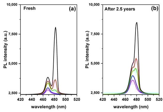 Additionally, after two years of storage at RT, the time-dependent PL demonstrated the blue shift relative to the initial PL. The irreversible photo-oxidation of perovskite is what causes the blue shift and photo-bleaching of perovskite [].