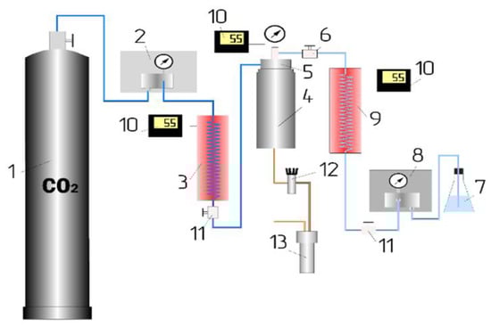 Schematic diagram of the experimental apparatus for supercritical SEDS dispersion of polymer blends: 1—cylinder with CO2; 2—CO2 supply pump; 3—CO2 heater; 4—reactor (precipitation vessel); 5—coaxial nozzle; 6—valve on the solution supply line to the nozzle; 7—container for a solution (test sample + organic solvent); 8—solution supply pump (THAR, USA); 9—solution heater; 10—temperature control; 11—valve; 12—back pressure regulator; and 13—separator.