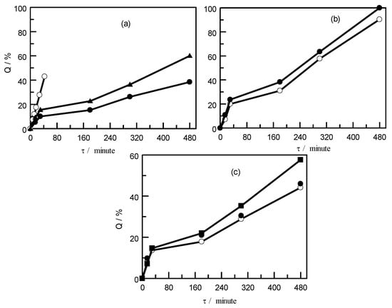 Solubility (Q) of PE in various organic solvents as a function of time at selected temperatures: (a) in toluene at ●-T = 373 K; ο-T = 353 K; and ▲-T = 323 K; (b) in dichloromethane at T = 308.15 K; and (c) in chloroform at T = 323 K.