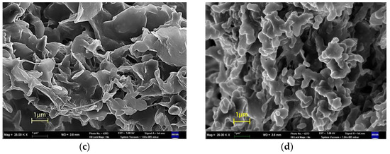 SEM image (morphology) of PVC (50%)/HPPE(50%) blend, produced by SEDS dispersion at various temperatures and pressures: (a)—T = 313 K, P = 8 MPa; (b)—T = 313 K, P = 15 MPa; (c)—T = 313 K, P = 25 MPa; and (d)—T = 333 K, P = 15 MPa.