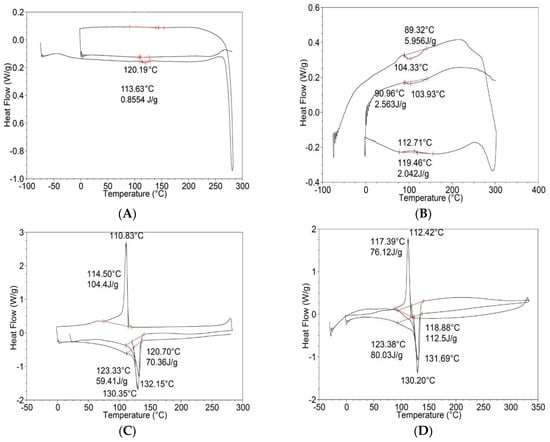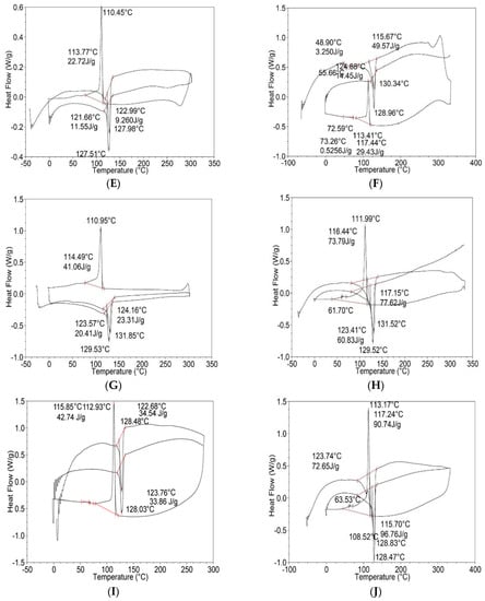 Polymer samples obtained by SEDS and blending in the melt were analyzed using a differential scanning calorimeter (DSC). Before studying the melting and crystallization processes of HPPE/PVC polymer blends obtained both by blending in the melt and in supercritical carbon dioxide (SEDS process), the DSC diagrams of the original pure components HPPE and PVC were analyzed. The results of the DSC of HPPE/PVC polymer blends and its pure components produced by SEDS and blending in the melt are depicted in Figure 6A–J. As the DSC experiment shows (Figure 6A), the melting-crystallization-melting diagram of the original pure PVC exhibits a very small peak at a temperature of 120.19 °C, with a heat of fusion of 0.85 kJ/kg, which indicates an absence of crystalline phase, since commercial PVC is an amorphous polymer. During the cooling run, no significant peaks and inflections are observed, which indicates the absence of the PVC crystallization process. Reheating also shows no change in the DSC curve behavior, which confirms the absence of a crystalline phase.