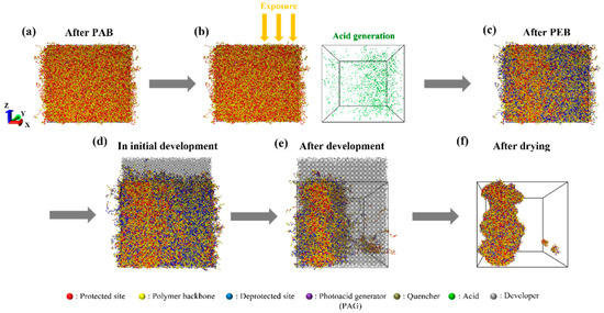 After the exposure process, the resist underwent a post-exposure bake (PEB). During the PEB step, the generated acids are displaced by the diffusion length , which is governed by the diffusion constant (D = 0.2 nm2/s) and time interval (dt = 0.02) per MC cycle (Figure 3c). The reported acid diffusion coefficient varies widely depending on factors such as the resist constituent material and PEB temperature. However, in this study, we adopted the acid diffusion coefficient that had been previously found to yield the lowest LER in PROLITH simulations [22]. The diffused acids reacted with the nearest protected site (deprotection) or quencher (neutralization) within 0.2 nm in a single iteration step. The reaction parameters, which included the thermalization length, the deprotection/neutralization reaction radius, and diffusion constant, were chosen by referring to previous simulation studies of EUV lithography [22,40,41]. Polymer chains were set to be immobile because we assumed that the PEB temperature was lower than the glass transition temperature (Tg) of the resist. A low number of 3000 simulation iterations was used to depict a standard PEB time of 60 s. Figure 3d,e show that the protected functional group (red) reacting with the acid changed to a deprotected site (blue), whereas the reacted quencher, which is represented by white particles, neutralized the acid. Figure 1c shows a snapshot of the resist after the completion of the PEB process.