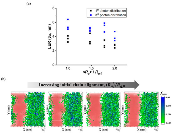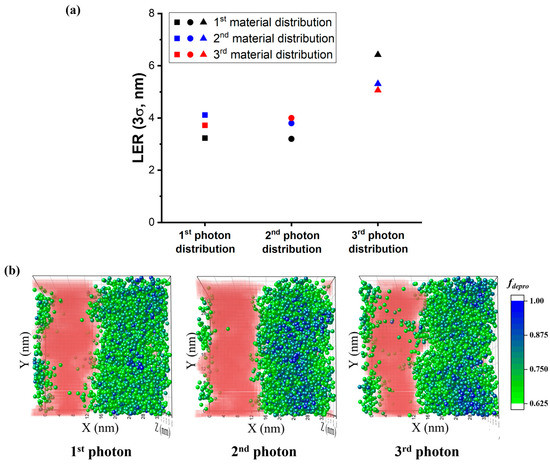 The LER values of the residual resist consisting of coarse-grained polymer chains of N = 64 were measured, and the results summarized in Figure 4a reflect these values when the photon distributions in Figure 2 were applied. To investigate the stochastic effect induced by various distributions of material components (polymer chains, PAG, and quencher molecules) on LER as well as the photon shot noise, the patterning procedures and calculation of 3σ were repeated for three initial random material conformations in the resist. In Figure 4a, the results of three different initial material configurations are marked in black, blue, and red, and three different photon distributions are indicated with squares, circles, and triangles; i.e., each color corresponds to a specific initial material configuration and each shape corresponds to a specific photon distribution. Figure S1 compares the selected chain conformations at the interface and inside the unexposed area after the development process; after the developing solvent had been dried, collapsed chains were observed at the interface and relaxed chains were seen inside the resist. Figure 4 shows that even under an identical photon distribution, interfacial roughness varied considerably due to the variability in the initial random chain conformations. The variation in the material distribution caused LER to range from 3.2 nm to 4.1 nm, from 3.2 nm to 4.0 nm, and from 5.1 to 6.4 nm, for the first, second, and third photon distributions. The third photon distribution noticeably resulted in a larger LER regardless of the material distribution, implying that the stochastic effects from the photon distribution are a more dominant factor in determining LER than those from the randomness in the chain conformation. Additionally, we explored the effect of chain length on the roughness (Figure S2) and found that, contrary to our previous work, which showed that resists with a smaller molecular weight and high Tg have a lower LER due to the smaller size of residual chains, causing them to collapse after drying [27], significant differences between the resists of different molecular weights were not found when stochastic effects were included in the simulations. We anticipate that chain length could become a more significant factor in reducing LER when the stochastic effect is suppressed, e.g., as would occur when a higher dose is used.