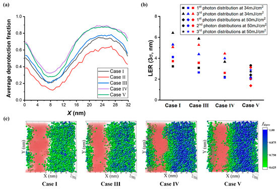 Figure 5b illustrates LER of the final patterns under different photochemical reaction conditions (Case I, III, IV, and V). In this figure, different colors and shapes of markers correspond to different material conformations and photon distributions. For Case I–IV, the resists exposed to the 34 mJ/cm2 EUV dose of the first and third photon distributions are marked in squares and triangles, respectively. For Case V, the roughness at 50 mJ/cm2 dose is represented by diamonds, circles, and stars, and the applied photon distributions are shown in Figure S4.