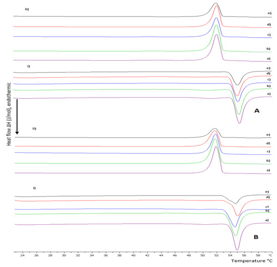 DSC thermograms during (i) heating and (ii) cooling of (A) DSPC:P(OEGMA950-DIPAEMA)-1 and (B) DSPC:P(OEGMA950-DIPAEMA)-2 hybrid bilayers in different weight ratios: (a) 9:1, (b) 8:2, (c) 7:3, (d) 6:4, and (e) 5:5 hydrated in HPLC-grade water (pH 7.0).