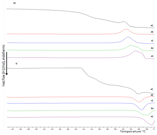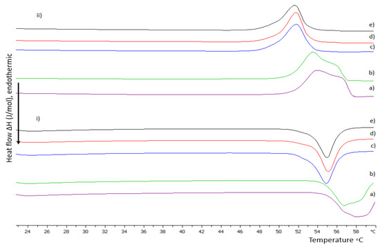DSC thermograms during (i) heating and (ii) cooling of DSPC:P(OEGMA950-DIPAEMA)-2 hybrid bilayers in different weight ratios: (a) 9:1, (b) 8:2, (c) 7:3, (d) 6:4, and (e) 5:5 dispersed in HCl 0.1 N (pH 1.2).