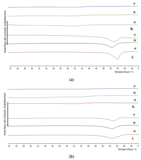 DSC thermograms during heating of hydrated (a) DSPC:DOPC:P(OEGMA950-DIPAEMA)-1 and (b) DSPC:DOPC:P(OEGMA950-DIPAEMA)-2 hybrid bilayers in different DSPC:DOPC weight ratios, (I) 9:1 and (II) 4:6, as well as different lipid to polymer weight ratios: (a) 9:1, (b) 7:3, and (c) 5:5.